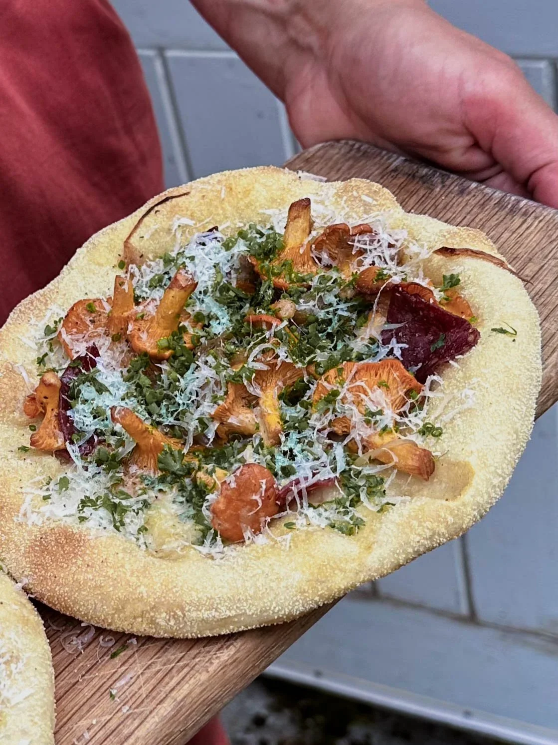 Flatbreads with chanterelles and salami.