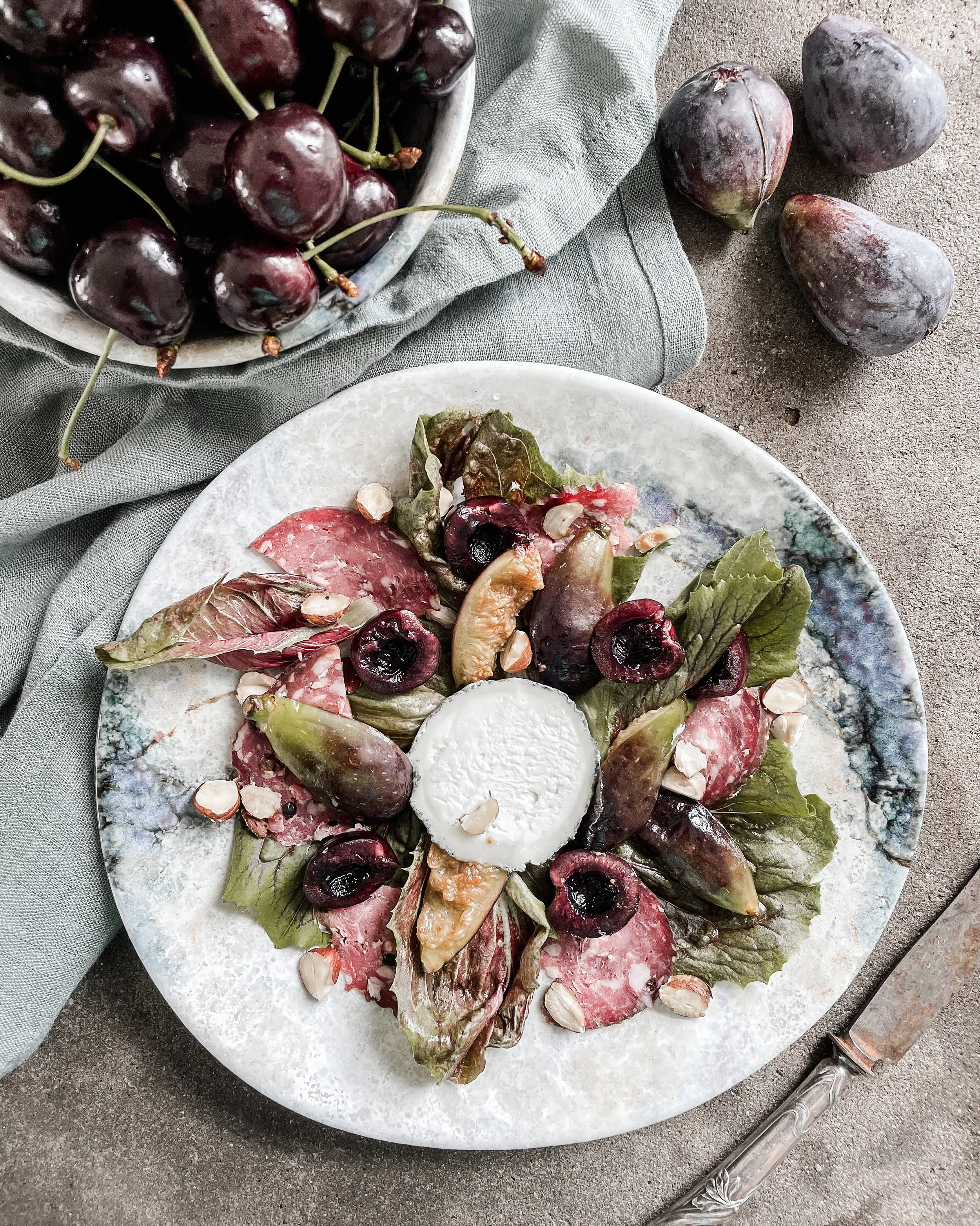 Venison Salami, Cherries & Goats Cheese Salad