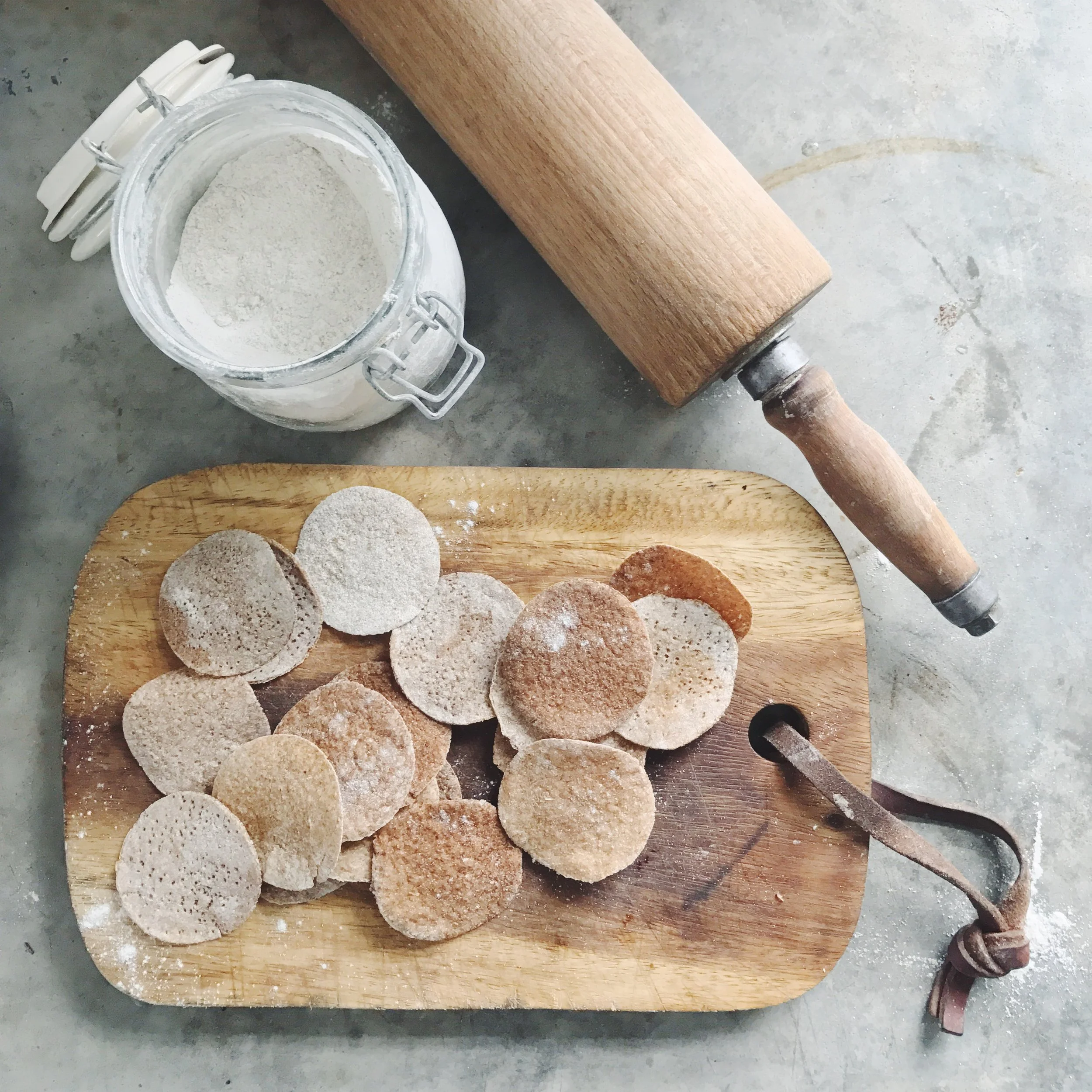 Cut small rounds and place them on a baking ray. If you find making rounds too fiddly you can bake the sheets and break them in pieces after baking.
