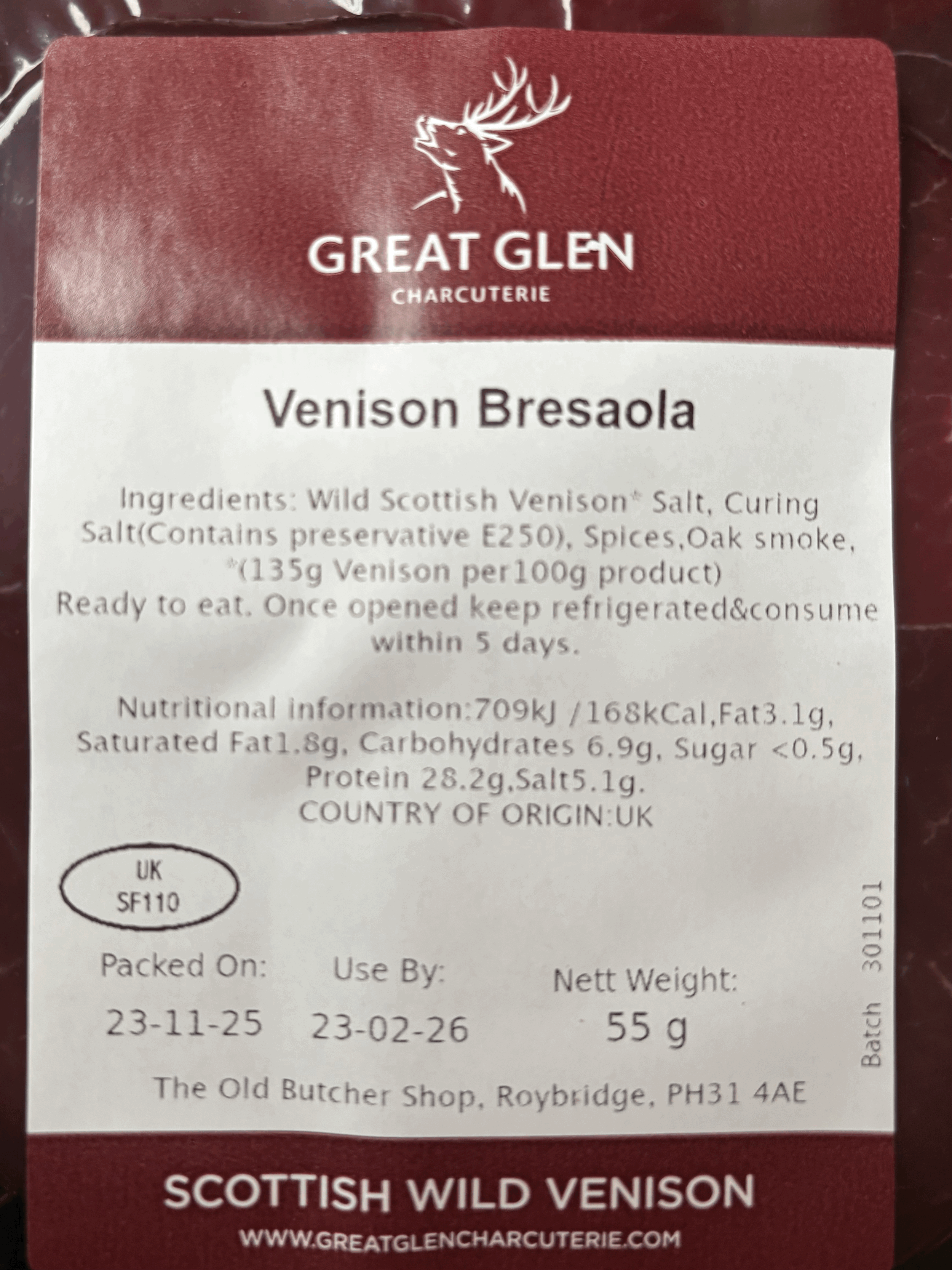 This is our only venison salami made with added Scottish pork. It is mildly spiced with cracked black peppercorns, a more robust salami.